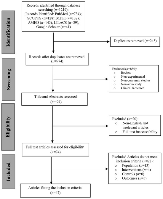 The process of study selection is represented in the PRISMA flow diagram (Figure 1). A total of 1219 records were first identified using electronic database searches, comprising contributions from PubMed (n = 734), SCOPUS (n = 128), AMED (n = 145), LILACS (n = 39), MDPI (n = 132), and Google Scholar (n = 41). Following the elimination of 245 duplicate records, 974 distinct records were retained for screening. In the title and abstract screening step, 880 records were rejected for failing to meet the inclusion criteria. The exclusions were mainly attributed to the articles being reviews, non-experimental studies, unconnected to curcumin, non-in vivo investigations, clinical research, non-English publications, or otherwise inappropriate to the topic under investigation. This resulted in 94 records for additional evaluation. Twenty items were eliminated after a comprehensive assessment of the whole text due to inaccessibility or classification as reviews or analytical articles. Seventy-four full-text papers were evaluated for eligibility. After a comprehensive evaluation, 22 additional publications were removed for failing to meet the specified inclusion criteria, as 13 did not have the required population, 4 did not satisfy the intervention criteria, and 5 lacked outcome data. None were excluded based on control criteria.