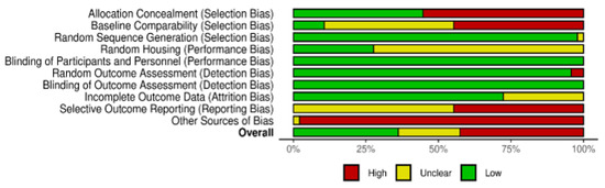 Quality of reporting and bias evaluation conducted with SYRCLE’s risk of bias tool. The upper panel illustrates the quality of reporting and bias risk in the included studies, while the lower panel evaluates biases related to selection, performance, detection, attrition, and other factors [24,25,26,27,28,29,30,31,32,33,34,35,36,37,38,39,40,41,42,43,44,45,46,47,48,49,50,51,52,53,54,55,56,57,58,59,60,61,62,63,64,65,66,67,68,69,70,71].