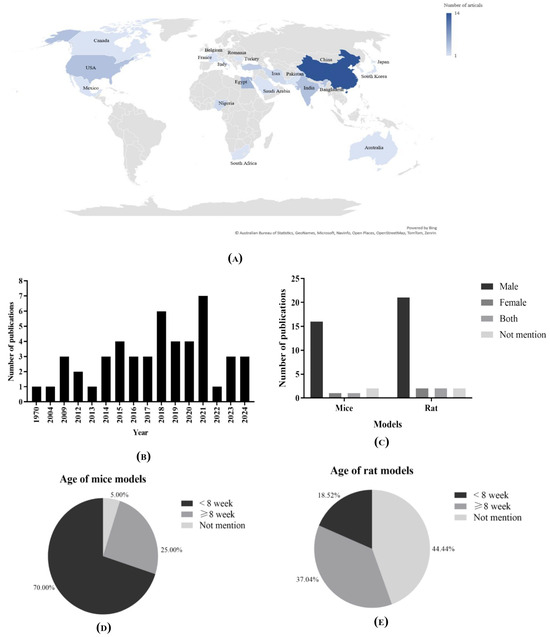As depicted also in Table 2 and Figure 3, the selected studies (n = 47) used various rodent species, such as Wistar rats, Sprague Dawley rats, and C57BL/6J mice. Rats were the leading species (n = 28) with 59.57% [24,25,26,27,28,29,31,32,33,34,36,39,40,41,42,43,44,49,50,54,56,58,59,60,61,64,65,68], while the remaining 40.43% (n = 19) were mice [30,35,37,38,45,46,47,49,51,52,53,55,57,62,63,66,67,69,70]. A closer look at the age of animal models used in the included studies reveals notable differences between rat and mouse experiments. Among the rat studies, 39.28% (n = 11) explicitly stated the use of rats aged 8 weeks or older [26,29,33,34,36,39,40,42,43,49,51,56]. In contrast, only 17.29% (n = 4) used rats younger than 8 weeks [27,32,60,61].