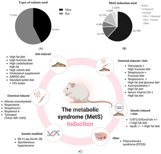 Types of rodents used in the included studies (A) and the detailed methods (B,C) for inducing metabolic syndrome in these rodents.