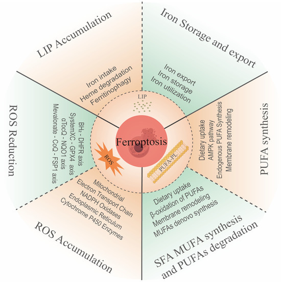 Main pro- and anti-ferroptosis mechanisms. Iron accumulation, ROS accumulation, and PUFA generation are considered main features and mechanisms to drive ferroptosis. Correspondingly, there are different mechanisms to counteract these three mechanisms to inhibit ferroptosis.