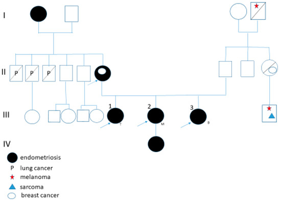 A multigenerational family was referred for genetic counseling due to a high incidence of endometriosis among its members (Figure 1). Three sisters (T., 51 years old; M., 48 years old; and B., 44 years old), their mother, grandmother, and the daughter of one of the sisters were all affected. Additionally, the mother was diagnosed with breast cancer at the age of 65. On the maternal side, three uncles died of lung cancer, possibly in association with environmental risk factor exposure during their lives. The father, currently 75 years old, has been diagnosed with senile dementia. On the paternal side, an aunt had breast cancer, and her son was diagnosed with both melanoma and sarcoma at the age of 44. The paternal grandfather also had melanoma.