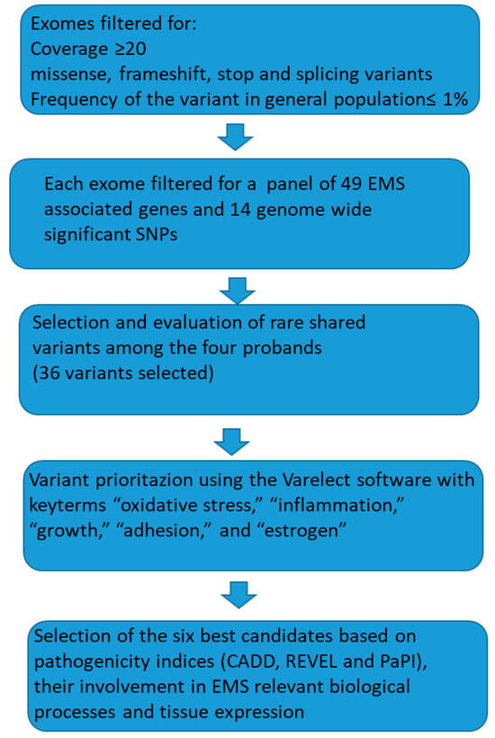 Given the complex etiology of EMS and the estimated heritability at 50% based on genome-wide association studies (GWASs) and linkage analyses, we conducted whole-exome sequencing (WES) in a three-generation family affected by EMS to identify potential candidate genes associated with the disease. This approach is particularly powerful in detecting rare variants for complex disorders like endometriosis because it allows the identification of inherited, disease-associated mutations by comparing affected and unaffected family members, reducing background genetic noise. We hypothesize that rare variants co-segregating in affected family members may contribute to EMS.