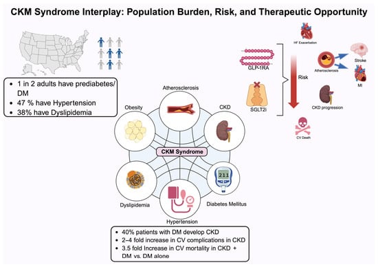 Approximately 40% of individuals with type 2 diabetes develop chronic kidney disease, and individuals with chronic kidney disease are two to four times more likely to die from cardiovascular complications than progress to kidney failure [2]. This complex network between cardiovascular disease, chronic kidney disease, and type 2 diabetes mellitus (T2DM) is driven by chronic inflammation, insulin resistance, endothelial dysfunction, hemodynamic stress, and neurohormonal activation which allows for widespread organ dysfunction. Common risk factors contributing to CKM syndrome include hypertension, excess adiposity, hyperglycemia, and elevated levels of cholesterol and triglycerides. In addition, sedentary lifestyle, poor dietary habits, and tobacco use also play a vital role in contributing to CKM syndrome. According to CDC estimates, 47% of U.S. adults have hypertension, 38% have dyslipidemia, and nearly one in two adults have prediabetes or diabetes, underscoring the widespread nature of CKM-related risk factors. Common complications of CKM syndrome include end-stage renal disease, increasing albuminuria, atherosclerotic cardiovascular disease, stroke, and decreasing glomerular filtration rate (GFR) which may lead to elevated risk of cardiovascular death, all-cause mortality, and hospitalization. Clinical studies have demonstrated that the coexistence of any two CKM-related conditions—such as diabetes and chronic kidney disease—substantially increases the risk of adverse cardiovascular outcomes, including heart failure, stroke, and cardiovascular mortality, in an exponential manner compared to the presence of a single condition [3]. For instance, individuals with both diabetes and CKD have a 3.5-fold increased risk of cardiovascular mortality compared to those with diabetes alone. The synergistic risk profile associated with the coexistence of diabetes, chronic kidney disease (CKD), and cardiovascular disease (CVD) results in disproportionately elevated rates of mortality and hospitalization compared to each condition in isolation. Historically, traditional treatment paradigms have approached CVD, CKD, and type 2 diabetes mellitus (T2DM) as distinct entities, often leading to fragmented care, overlapping pharmacologic side effects, and missed opportunities for integrated management. A systems-based holistic approach to simultaneously target the cardiovascular, renal, and metabolic systems has been shown to reduce hospitalizations, sustain organ function, and improve long-term outcomes [4,5,6].