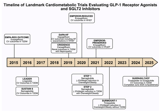 This timeline summarizes key randomized clinical trials assessing cardiovascular (CV), including heart failure (HF), renal, and metabolic outcomes associated with sodium–glucose cotransporter-2 (SGLT2) inhibitors and glucagon-like peptide-1 (GLP-1) receptor agonists in individuals with type 2 diabetes mellitus (DM), heart failure with reduced ejection fraction (HFrEF), heart failure with preserved ejection fraction (HFpEF), nephropathy, and obesity. Each entry denotes the trial name, agent studied, primary outcomes, and study population. Abbreviations: EMPA-REG OUTCOME, Empagliflozin Cardiovascular Outcomes, and mortality in DM; LEADER, Liraglutide Effect and Action in Diabetes: Evaluation of CV Outcome Results; SUSTAIN 6, Semaglutide and CV Outcomes in patients with DM; CREDENCE, Canagliflozin and renal outcomes in DM and nephropathy; DAPA-HF, Dapagliflozin in patients with HFrEF; EMPEROR-Reduced, Empagliflozin Outcomes in HFrEF; EMPEROR-Preserved, Empagliflozin Outcomes in HFpEF; STEP 1, Once-Weekly Semaglutide in Adults with Overweight or Obesity; STEP 2, Semaglutide 2·4 mg once a week in adults with overweight or obesity, and DM; SURMOUNT-1,Tirzepatide Once Weekly for the Treatment of Obesity; SURPASS CVOT, Tirzepatide compared with Dulaglutide on major CV events participants with DM.