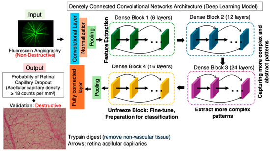 Deep learning model for capillary dropout detection using fluorescein angiography (FA). A DenseNet-169-based AI model was trained on FA images to predict capillary dropout. The ground-truth (acellular capillary density) was based on trypsin digest (destructive) to count acellular capillaries (arrows).