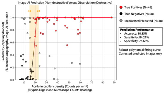 The image-AI classification model used Densely Connected Convolutional Networks (DenseNet-169) to predict capillary early dropout versus normal control from FA images. DenseNet-169 is a deep convolutional neural network known for its densely connected layers, where each layer receives feature maps from all preceding layers, enhancing feature propagation and reducing the number of parameters. In this study, we applied transfer learning by leveraging the pre-trained weights of DenseNet-169, which were originally trained on large-scale image datasets, fine-tuning the last convolutional block and the fully connected classification layer to adapt the model for our classification task, while keeping the earlier feature extraction layers unchanged (Figure 2). This approach allowed the model to retain general image feature representations while learning to classify acellular capillary density as exceeding or falling below 18 counts per mm2. As shown in Figure 3, the deep learning model can achieve an overall accuracy of 80.85%, with a sensitivity of 84.21%, specificity of 75.68%, and an area under the receiver operating characteristic (ROC) curve (AUC) of 0.86 via a 5-fold cross-validation. Among the total images analyzed, the model correctly identified 48 true positives and 28 true negatives, with 18 incorrect predictions. The robust polynomial fitting curve (Figure 3), generated from correctly predicted cases, suggests that the 15 to 23 counts per mm2 range may represent a critical transition window for early DR progression. Within this range, AI-predicted probability aligns strongly with observed trypsin digest-based acellular capillary density counts. This finding suggests that fluctuations in acellular capillary density within this window could be biologically significant for early DR progression. Beyond this range—below 15 or above 23 counts per mm2—the AI-predicted probability does not show a strong correlation with observed density values. Specifically, when acellular capillary density exceeds 23 counts per mm2 or falls below 15 counts per mm2, the AI-predicted probability reaches a plateau, suggesting a potential saturation effect or insufficient sensitivity in these extreme ranges.