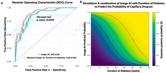 While the duration of diabetes is a well-established and significant risk factor for diabetic retinopathy, not all diabetic patients develop retinopathy, and not all individuals with DR have a long history of diabetes. In humans, one-third of individuals with diabetes will develop DR [2]. More importantly, the timing of DR onset varies among individuals, and the recorded duration of diabetes is often inaccurate in real clinical settings. We investigated whether including the duration of diabetes as a prior knowledge to integrate a real-time image-AI-based Bayesian framework can increase the early capillary dropout detection power. We used a logistic regression to model the relationship between diabetes duration and the probability of acellular early capillary dropout (acellular capillary density ≥ 18 counts per mm2). This probability was then incorporated into a Bayesian formula (see Section 2) to compute the posterior probability of real-time AI image-based early capillary dropout detection. As shown in Figure 4A, incorporating the duration of diabetes as a prior with the image AI model resulted in improved classification performance compared to the image AI model alone. The AUC of the ROC curves for the AI-based model alone and Bayesian model incorporating diabetes duration achieves are 0.86 and 0.90, respectively. The difference is statistically significant (DeLong’s test p-value = 0.0045). This finding suggests that combining prior knowledge (duration of diabetes) with real-time AI-based image predictions can enhance the reliability and robustness of early capillary dropout detection.