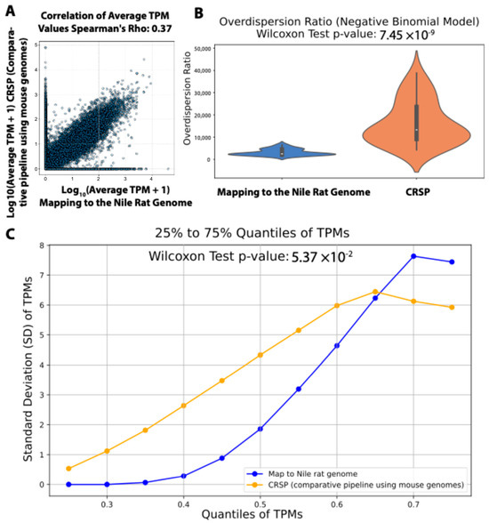We first calculated the Spearman’s rank correlation coefficient (Rho) between transcripts per million (TPMs; gene expression values) estimated by CRSP (comparative RNA-seq pipeline), which was used in our prior study, versus TPMs obtained from mapping reads to the newly sequenced and annotated Nile rat genome. The correlation was moderate (Rho = 0.37), suggesting a substantial discrepancy between these two computational approaches. Given that RNA-seq read count distributions are often modeled using a negative binomial (NB) distribution [24,25,26], we next examined whether gene read counts estimated by CRSP and genome mapping both followed the expected NB distribution. In the NB framework, the overdispersion ratio is used to quantify the extent to which variance exceeds the mean. A higher overdispersion ratio indicates greater variability in gene expression, often due to technical noise. In contrast, a lower overdispersion ratio suggests more stable gene expression estimates, with variance closer to the mean, making the data less affected by unwanted variability. To assess this, we calculated the overdispersion ratio for both approaches. We found that transcript read counts estimated by mapping to the newly sequenced Nile rat genome had a statistically significantly lower overdispersion ratio compared to those estimated using CRSP (Figure 5B). This suggests that RNA-seq expression estimates obtained from direct genome mapping exhibit greater reliability than those generated using the CRSP strategy, which relies on cross-species computational imputation and may introduce additional noise due to sequence divergence and incomplete transcript annotation.