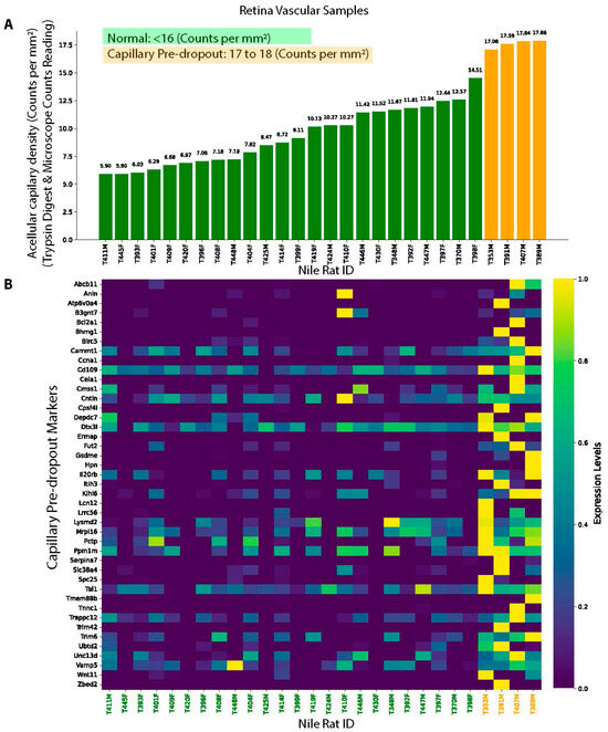 Gene markers associated with capillary pre-dropout state. (A) Nile rat RNA-seq samples used for gene marker identification, with green indicating normal and orange representing pre-dropout samples before early DR. (B) Identified gene markers associated capillary pre-dropout.