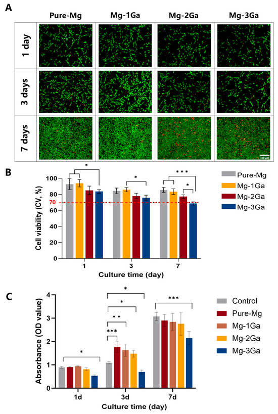 In vitro cell viability results of rBMSCs cultured in pure Mg and Mg-xGa (x = 1%, 2%, and 3%, wt.%) alloy extracts for 1, 3, and 7 days. (A) The living/dead staining images of rBMSCs (green for living cells and red for dead cells); (B) cell viability of rBMSCs quantified by living/dead staining (* p < 0.05 and *** p < 0.001); (C) CCK-8 of rBMSCs (* p < 0.05, ** p < 0.01, and *** p < 0.001).