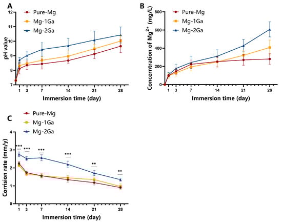 In vitro degradation behavior of pure Mg and Mg-xGa (x = 1%, 2%, wt.%) immersed in DMEM for 28 days. Variation of DMEM pH value (A), Mg2+ concentration (B), and corrosion rate calculated by weight loss (C) with immersion time (** p < 0.01 and *** p < 0.001).