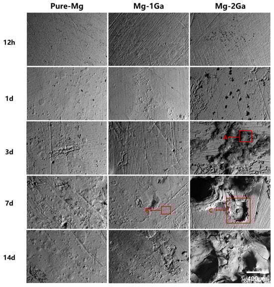 The microscopic surface morphology of the three groups of samples after immersion in DMEM medium for different periods is presented in Figure 3. After 12 h of immersion, a small number of corrosion pits with a width of 10–15 μm appeared on the surface of pure magnesium. Micrometer-sized raised areas formed by corrosion product deposition appeared on the surface of Mg-1Ga, and the corrosion pits on the surface of Mg-2Ga were densely distributed. After 1 day of immersion, the amount of corrosion pits on the surface of Mg-2Ga increased, and the range of corrosion pits was enlarged, with a maximum width of 30 μm. After 3 days of immersion, the surface of the pure magnesium and Mg-1Ga alloys formed a continuous and homogeneous layer of corrosion products, with a fine scale-like microscopic morphology and a high degree of surface smoothness, with no obvious craters or bulges, while a large range of corrosion product bulge areas could be seen on the surface of Mg-2Ga in comparison. After 7 days of immersion, the laminar corrosion product films on the surfaces of pure magnesium and Mg-1Ga alloys remained homogeneous and intact, and no significant pitting pits or localized product buildups were observed on their surfaces, while corrosion pits were visible on the surface of Mg-2Ga, with a width extending to 420 μm, indicating that the degree of localized corrosion intensified with the immersion time. With the extension of the immersion time to 14 days, the surface morphology of the corrosion product layer of pure magnesium and Mg-1Ga alloy remained stable without obvious structural damage, while the localized corrosion of Mg-2Ga was further aggravated, and large-scale dissolution of the passivation film peeled off.