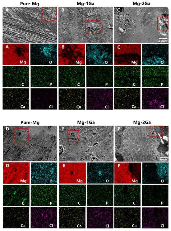 EDS analysis was performed on the surface after 7 and 14 days of immersion, and the results are depicted in Figure 4. At 7 and 14 days, obvious corrosion pits are seen on the surface of Mg-2Ga (Figure 4C,F), which indicates that the corrosion products are dissolved and detached, and the elemental mapping reveals that Cl is clearly enriched here. While in the corrosion product bulge area (Figure 4A,B,D) and the flat area (Figure 4E), the Cl content is relatively small. This also confirms the role of Cl- in the dissolution and detachment of corrosion products, as mentioned earlier.