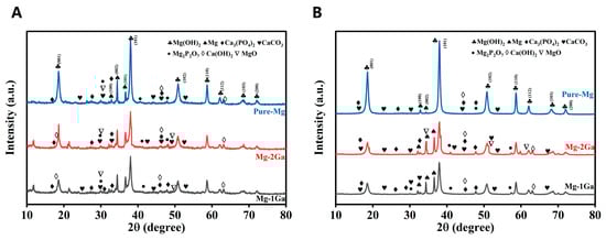 Figure 5 presents the XRD patterns of the corrosion products of pure Mg and Mg-Ga alloys after 14 days (A) and 28 days (B) of immersion. As can be seen in the figure, the composition of the physical phase of the corrosion products of pure Mg and Mg-Ga alloys is the same, i.e., the crystalline phase Mg (OH)2. During the corrosion process in the simulated physiological environment, the surface of magnesium alloys mainly generates typical corrosion products such as MgO, Mg (OH)2, carbonate, phosphate, and hydroxyapatite [39]. Among them, carbonate and phosphate compounds (e.g., MgCO3 and Ca-P salts) are mainly enriched in the outer layer of corrosion products to form a dense structure, which can significantly inhibit further corrosion of the substrate.