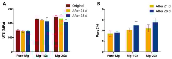 The residual strength and the rate of residual strength loss after 21 and 28 days of immersion are shown in Figure 6. For 21 days of immersion, the residual strength loss rates of pure Mg, Mg-1Ga, and Mg-2Ga were 3.17%, 4.11%, and 4.42%, respectively; for 28 days of immersion, the residual strength loss rates of pure Mg, Mg-1Ga, and Mg-2Ga were 3.62%, 4.93%, and 5.53%, respectively. After 28 days of immersion, the residual strengths of Mg-Ga alloys were 212.27 ± 26.16 MPa for Mg-1Ga and 207.83 ± 19.27 MPa for Mg-2Ga, which were much higher than that of pure Mg (143.09 ± 7.10 MPa). The high mechanical strength exhibited by Mg-Ga alloys after corrosion meets the requirements of implants for guided bone regeneration.