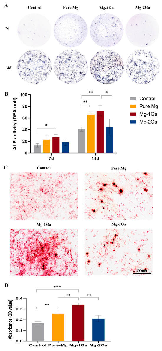 Figure 7C demonstrates images of alizarin red staining performed on each group, and the darkest staining of Mg-1Ga calcium deposits is seen. Figure 7D shows that calcium deposits were solubilized by CPC and quantitatively analyzed, and the results showed that calcium deposits in the Mg-1Ga group were significantly higher than the rest of the groups.