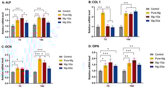 qRT-PCR results showed that Mg-1Ga significantly up-regulated the expression of osteogenesis-related genes ALP, COL 1, OCN, and OPN (Figure 8). At 7 days of incubation, ALP, OCN, and OPN were significantly up-regulated in the Mg-1Ga group compared with the control group, in which the expression levels of ALP and OPN genes were significantly higher than those in the pure Mg group. At 14 days of incubation, all four genes were significantly up-regulated in the Mg-1Ga group compared with the control group.