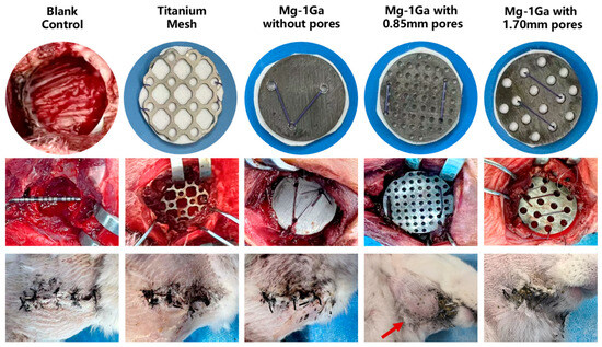 From the results of the above in vitro experiments, it is evident that compared with Mg-2Ga, Mg-1Ga significantly increased ALP activity, ECM mineralization, and the expression of osteogenic-related genes ALP, COL 1, OCN, and OPN were significantly up-regulated, which had a favorable effect of promoting osteogenic differentiation. Therefore, Mg-1Ga was chosen to carry out the subsequent in vivo study. In order to further investigate the porosity effect of Mg-1Ga alloy barrier membrane on bone regeneration in vivo, in this study, Mg-1Ga was processed into three kinds of barrier membranes, namely, no pore, 0.85 mm pore size, and 1.70 mm pore size. A rabbit mandibular defect model was set up (Figure 9), and a blank control group and a control group of titanium mesh (the gold standard) were established, and micro-CT and histological tests were performed at 4 weeks and 8 weeks after the operation.