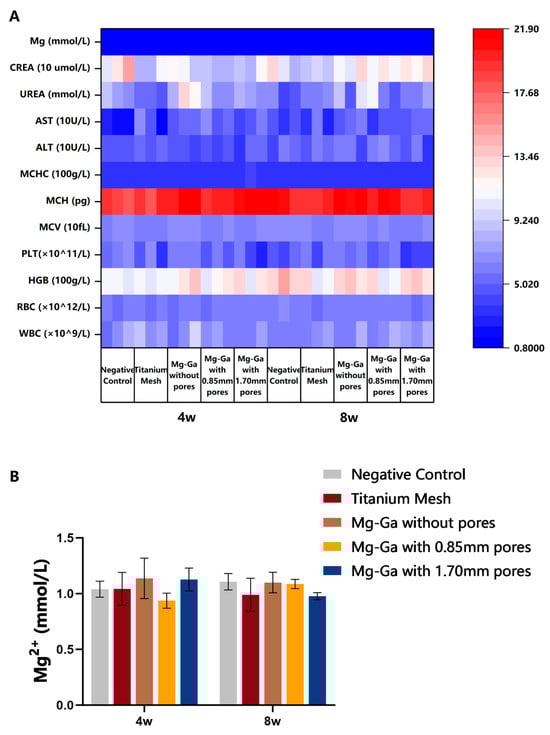 Blood test indexes of experimental rabbits 4 and 8 weeks postoperatively. (A) Heatmap of blood test indexes and (B) Mg2+ concentration in blood test.