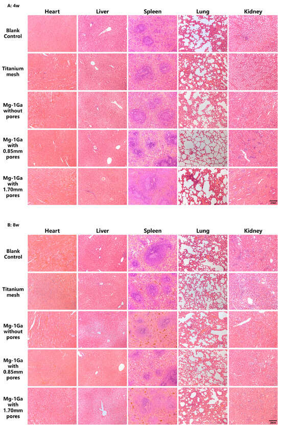 Blood samples were collected from the marginal ear vein of the tested animals prior to their sacrifice. The animals were analyzed for routine blood and blood biochemical parameters to assess the in vivo biocompatibility of the materials. Serum Mg2+ concentration was measured to assess the in vivo degradation and metabolism rate of Mg-Ga alloys using atomic absorption spectroscopy at 285.2 nm (iCETM 3400, Thermo Fisher Scientific, Waltham, MA, USA). The vital organs (heart, liver, spleen, lung, and kidney) were harvested at each time point (4 and 8 weeks) and subjected to hematoxylin and eosin (H&E) staining and observed under an optical microscope (BX53M, Olympus, Tokyo, Japan).