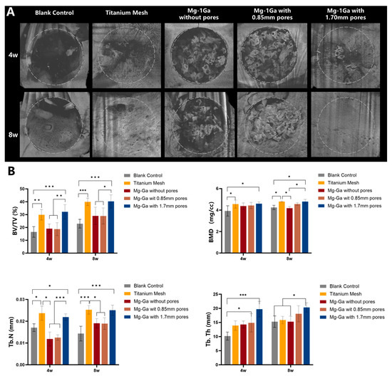 In vivo osteogenesis of Mg-1Ga with different pore sizes in a rabbit mandibular defect model. (A) Micro-CT reconstruction of newborn bone at 4 weeks and 8 weeks postoperatively, respectively. (B) Quantitative analysis of micro-CT data, including BV/TV, BMD, Tb. N, and Tb. Th (* p < 0.05, ** p < 0.01, and *** p < 0.001).