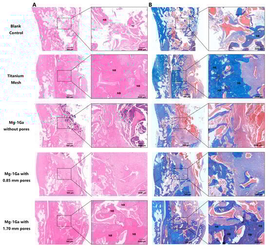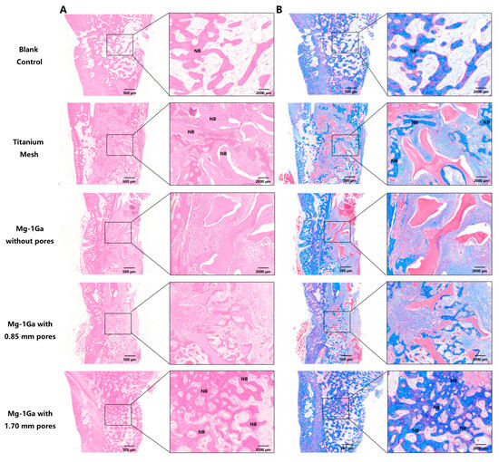 Histological characterization of newly formed bone at 4 weeks postoperatively. (A) Images of 4 weeks postoperative mandibular samples after decalcification by H&E staining (NB, new bone). (B) Images of 4 weeks postoperative mandibular samples after decalcification by Masson’s trichrome staining (NB, new bone).