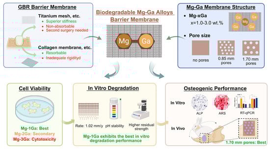 Background/Objectives: Guided bone regeneration (GBR) requires barrier membrane materials that balance biodegradation with mechanical stability. Magnesium (Mg)-based metals have good prospects for use as biodegradable barrier materials due to their elastic modulus, good biocompatibility, and osteogenic properties. In this study, gallium (Ga) was introduced into Mg to enhance the mechanical strength and optimize the degradation behavior of the alloy, addressing the limitations of conventional magnesium alloys in corrosion control and strength retention. Methods: Mg-xGa alloys (x = 1.0–3.0%, wt.%) were evaluated for biocompatibility, degradation, and osteogenic potential. Corrosion rates were calculated via weight loss, Mg2+ release, and pH changes. Osteogenic effects were assessed using rat bone marrow mesenchymal stem cells (rBMSCs) for alkaline phosphatase (ALP) activity, extracellular matrix (ECM) mineralization, and osteogenic-related gene expression. Optimal alloy was fabricated into barrier membranes with different pore sizes (0.85–1.70 mm) for the rabbit mandibular defect to evaluate the porosity effect on new bone formation. Results: Cytocompatibility tests established a biosafety threshold for Ga content below 3 wt.%. Mg-1Ga demonstrated uniform corrosion with a rate of 1.02 mm/year over 28 days. In vitro, Mg-1Ga enhanced ALP activity, ECM mineralization, and osteogenic gene expression. The 1.70 mm pore size group exhibited superior new bone formation and bone mineral density at 4 and 8 weeks. Conclusions: These results highlight Mg-1Ga’s biocompatibility, controlled degradation, and osteogenic properties. Its optimized pore design bridges the gap between collagen membranes’ poor strength and titanium meshes’ non-degradability, offering a promising solution for GBR applications.