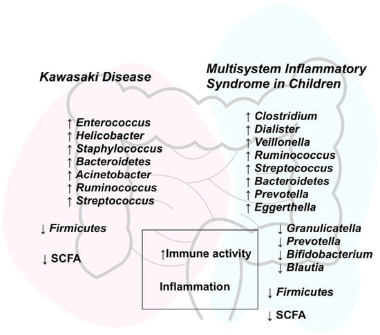 KD and MIS-C are serious conditions predominantly affecting children and are characterized by systemic inflammation [1]. MIS-C, also referred to as PIMS, is often described as a “Kawasaki-like” illness due to its similar clinical presentation [2,3]. Both diseases frequently lead to complications, particularly of a cardiovascular nature [1]. KD is an acute systemic vasculitis, whereas MIS-C is a hyperinflammatory condition typically occurring 2 to 6 weeks following SARS-CoV-2 infection [4,5]. The two syndromes share a range of clinical symptoms, including rash, fever, gastrointestinal disturbances, and cardiovascular involvement. However, they differ in epidemiological features, specific clinical manifestations, and diagnostic criteria [5]. Recent studies have suggested that a significantly altered gut microbiome may play a critical role in the pathophysiology of both conditions [6,7]. Motivated by this observation, we aimed to investigate the relationship between the gut microbiome and the pathomechanisms of these diseases by conducting a comprehensive review of the latest scientific evidence. The intestinal microbiota plays a pivotal role in immune system regulation, including the modulation of immune cell activity, coordination of host defense responses to pathogens, and maintenance of immunological homeostasis [8]. Based on this, it is plausible to assume that disruptions in the gut microbiome are crucial in the development of inflammatory diseases. Microbiota imbalances—referred to as dysbiosis—may lead to inappropriate immune responses and the initiation of pathological inflammation [9]. In MIS-C, dysbiosis is characterized by a reduction in microbial diversity and abundance, contributing to intestinal barrier dysfunction [6,10]. Similarly, in KD, the epithelial barrier of the intestine—constituting the body’s first line of defense—is compromised. It is hypothesized that patients with KD exhibit increased intestinal permeability, which may allow for the translocation of pathogens or microbial products into the bloodstream, thereby triggering a cascade of systemic inflammatory responses characteristic of KD [4]. In KD patients, a marked reduction in SCFA production has been observed, associated with decreased levels of Blautia species, which may increase susceptibility to the disease. Moreover, individuals with a history of KD exhibit elevated levels of Ruminococcus gnavus, a bacterium known to produce pro-inflammatory polysaccharides [7,11,12]. In the case of MIS-C, particular attention has been drawn to the predominance of Bacteroides, Eggerthella, and Prevotella species. These taxa have been implicated in the production of pro-inflammatory cytokines and are believed to contribute to disease pathogenesis [6]. Dysbiosis has also been linked to other immune-mediated disorders, such as inflammatory bowel diseases, prompting growing interest in therapeutic approaches targeting the microbiota [13,14]. The gut microbiome–immune system axis represents a promising avenue for both diagnostic and therapeutic interventions in KD and MIS-C. Restoration of intestinal barrier function, microbial diversity, and microbiota balance may potentially improve clinical outcomes and disease prognosis. This review aims to elucidate the interplay between dysbiosis, immune regulation, and clinical manifestations in both KD and MIS-C, highlighting the potential of microbiota-based strategies in advancing the understanding and treatment of these pediatric inflammatory disorders.