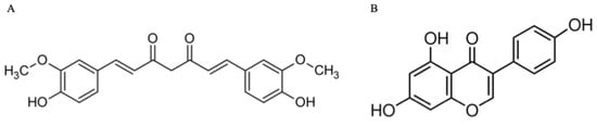 Melanoma is one of the deadliest forms of malignant skin cancers arising from melanocytes, responsible for a high rate of metastasis also as a consequence of the lack of no life-saving treatment for patients with advanced melanoma. In fact, the five-year survival rate exceeds 95% in the early stages of the disease, but survival rarely exceeds one year in the later stages [1]. The incidence of melanoma has considerably increased over the years, with a prevalence of approximately 300,000 cases per year and an estimate of approximately 470,000 new expected cases in 2040, with over 60,000 deaths each year [2]. Ultraviolet radiation exposure represents the main risk factor because of the stimulation of melanin production but also genetic mutations may play a significant role in the onset of melanoma as well as in the metastatic dissemination [3,4]. The most represented mutations depend on hereditary or sporadic origin, although some mutations such as that involving cyclin-dependent kinase inhibitor 2A (CDKN2A), a gene that encodes a 156 amino acid, 16 kD cell-cycle inhibitor protein, is common in familial and sporadic melanomas. The mutant p16CDKN2A is incapable of establishing stable complexes with CDK4/6 enzyme, consequently leading to an inadequate inhibition of cell progression during improper mitotic divisions. In addition, TP53, telomerase reverse transcriptase (TERT), BRAF and NRAS are common mutations observed in melanoma as well as in other cell types [5,6,7,8]. In particular, NRAS gene mutations occur in 20–30% of melanomas and rarely coexist with BRAF V600E, appearing together in 1% of cases only. This mutation, commonly found on exon 1 (codon 12) and exon 2 (codon 61), activates the MAP kinase pathway, thus causing the activation of the activated GPT state of the receptor tyrosine kinase. However, the largest molecular subtype is that defined by the presence of BRAF mutations, observed in approximately 50% of cutaneous melanomas. The most frequent BRAF mutation is V600E (approximately 85% of cases), followed by V600K (approximately 10%) and V600R (2%), which is anti-correlated with NRAS mutations. BRAF mutations may be also due to UV exposure and an association between BRAF mutation and clinical-pathological features has been detected, as well as an inverse relationship between BRAF mutation and age [9]. In the last 10 years, the treatment of melanomas improved with the adoption of monoclonal antibodies use, such as Ipilimumab and Pembrolizumab (both PD-1 inhibitors), BRAF inhibitors Dabrafenib and Vemurafenib and Trametinib (MEK inhibitor) [10]. These drugs act through checkpoint inhibition and targeted proliferation arrest in melanomas with BRAF mutation. The long-term treatment with BRAF and MEK inhibitors in association achieves a 5-year overall survival (OS) of 34% and a 5-year disease-free survival (PFS) of 19% [11]. However, these drugs not only are expensive but also fail to improve patient survival and their administration may cause adverse effects, such as immune-mediated colitis, hepatotoxicity and nephritis. The discovery of new therapies would be useful to guarantee better results and a higher disease-free survival rate. In this context, a growing interest was addressed to the use of phytochemicals and/or biologically active compounds of natural origin, thanks to their anti-emetic, antioxidant and anti-proliferative effects [12]. Previous experimental data showed that the phytochemicals flavonoids inhibit melanoma cells growth through the modulation of PI3K/AKT/mTOR and Wnt/β-catenin pathways [13,14]. Moreover, curcumin, a compound found in turmeric, showed promising results in the melanoma field, thus inhibiting cell growth and the metastatic potential by modulating the NF-κB pathway and microRNAs [15,16]. Despite the promising evidences obtained from preclinical studies, the clinical translation of phytochemicals use for the treatment of melanoma is still in early stages. Further research is needed to optimize the use of phytochemicals as complementary or alternative therapies for melanoma and to better understand the mechanism of action of these natural compounds, also in different conditions; therefore, the aim of this study was to investigate the anti-proliferative effects of the phenolic curcumin and genistein (Figure 1) in melanoma cell lines.