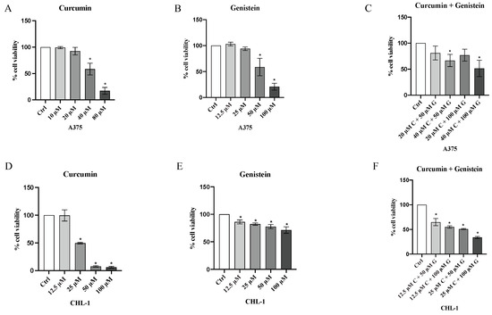 Cytotoxicity evaluated by MTT assay in A375 cell line treated with curcumin (A) (10, 20, 40 and 80 μM), genistein (B) (12.5, 25, 50 and 100 μM) and curcumin + genistein (C) (20 + 50, 40 + 50, 20 + 100, 40 + 100 μM) and in CHL-1 cell line treated with curcumin (D) (12.5, 25, 50 and 100 μM), genistein (E) (12.5, 25, 50 and 100 μM) and curcumin + genistein (F) (12.5 + 50, 12.5 + 100, 25 + 50 and 25 + 100 μM) for 24 h. The data are expressed as means ± SD; * p < 0.05 vs. Ctrl.