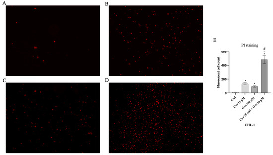 The figures show cell viability evaluated by PI staining of CHL-1 untreated (A), and treated with curcumin (B), genistein (C) and curcumin + genistein (D). In panels (A–D), the red staining indicates dead cells. Panel (E) shows CHL-1 fluorescent cell count. All images were captured at 10× of magnification. The data are expressed as means ± SD. * p < 0.05 vs. CTRL; # p < 0.05 vs. curcumin; ° p < 0.05 vs. genistein.