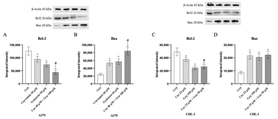 The graphs show Bcl-2 (A) and Bax (B) protein expression in A375 cells and Bcl-2 (C) and Bax (D) in CHL-1 cells treated with curcumin, genistein and curcumin + genistein. The data are expressed as means ± SD. * p < 0.05 vs. CTRL; # p < 0.05 vs. curcumin; ° p < 0.05 vs. genistein.