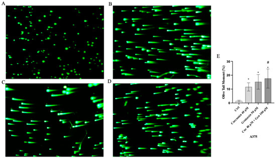 Cellular DNA damage measured by comet assay from Ctrl (A), curcumin (B), genistein (C) and curcumin + genistein (D) in A375 cells. All images were captured at 10× of magnification. The graph (E) shows the DNA damage represented as Tail Olive Moment. The data are expressed as means ± SD. * p < 0.05 vs. Ctrl; # p < 0.05 vs. curcumin.