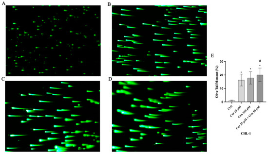 Cellular DNA damage measured by comet assay from Ctrl (A), curcumin (B), genistein (C) and curcumin + genistein (D) in CHL-1 cells. All images were captured at 10× of magnification. The graph (E) shows the DNA damage represented as Tail Olive Moment. The data are expressed as means ± SD. * p < 0.05 vs. Ctrl; # p < 0.05 vs. curcumin.