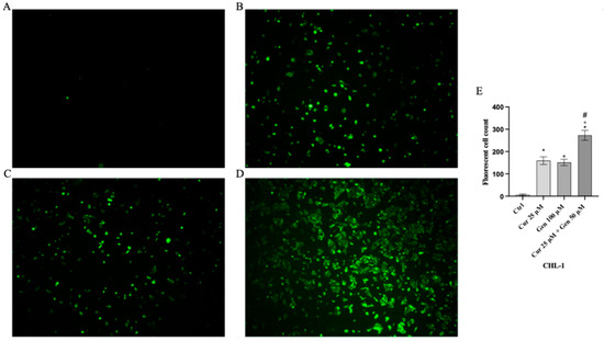 Intracellular ROS accumulation evaluated by CM-H2DCFDA fluorescent probe from CTRL (A), curcumin (B), genistein (C) and curcumin + genistein (D) in CHL-1 cells. All images were captured at 10× of magnification. Panel (E) Shows the number of Fluorescent cells. The data are expressed as means ± SD. * p < 0.05 vs. CTRL; # p < 0.05 vs. curcumin; ° p < 0.05 vs. genistein.
