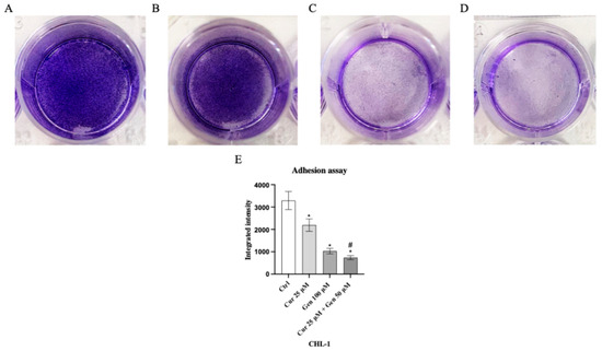 The images show the CHL-1 attached cells untreated (A) and treated with curcumin (B), genistein (C) and curcumin + genistein (D) and stained with crystal violet. Panel (E) shows the OD value measured at 570 nm using a microplate reader. The data are expressed as means ± SD. * p < 0.05 vs. Ctrl; # p < 0.05 vs. curcumin.