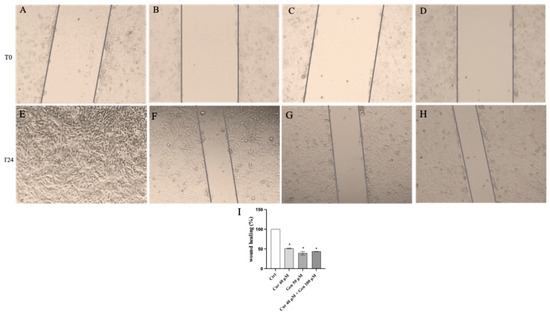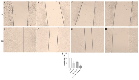 The panel shows Wound Healing Analysis in CHL-1 cells at T0 (A–D) and following 24 h (E–H) in cells treated with curcumin (F), genistein (G) and curcumin + genistein (H) The graph in (I) summarizes the percentage of wound healing in all experimental groups. All images were captured at 10× of magnification. The data are expressed as means ± SD. * p < 0.05 vs. Ctrl.
