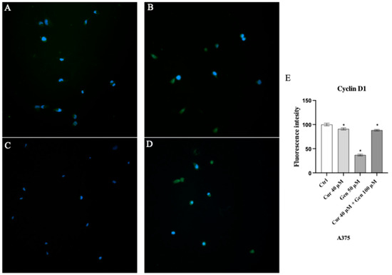 Immunofluorescence images of cyclin D1 (green fluorescence) for Ctrl (A), curcumin (B), genistein (C) and curcumin + genistein (D) treated A375 cells. Panel (E) shows fluorescent intensity observed in ten cells. The data are expressed as means ± SD. * p < 0.05 vs. Ctrl.
