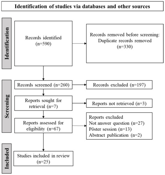 Figure 1 presents the study selection flowchart. A total of 590 records were identified across all databases. After automated deduplication and screening of titles and abstracts, 67 records remained for full-text examination and data extraction. Of these, 42 studies were excluded for the following reasons: 27 did not address the research question, 13 were posters, and 2 were abstracts. Consequently, 25 studies were deemed eligible [6,8,9,13,14,15,16,17,18,19,20,21,22,23,24,25,26,27,28,29,30,31,32,33,34]. Supplementary Table S4 provides a list of excluded studies along with justifications. Detailed characteristics of each study are presented in Supplementary Table S5. Most studies were published in 2022 (n = 6) [9,13,15,16,17,18].