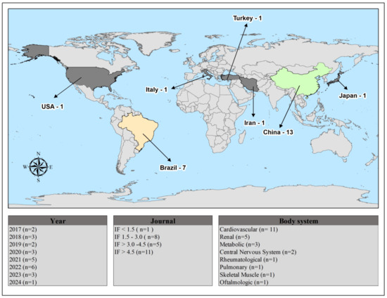Figure 2 provides a summary of the study features, including publication year, country, impact factor, and body system. All studies were described in English and were experimental in nature. Most of the studies were published in journals with an impact factor above 4.5, with the cardiovascular system being the most frequently investigated.