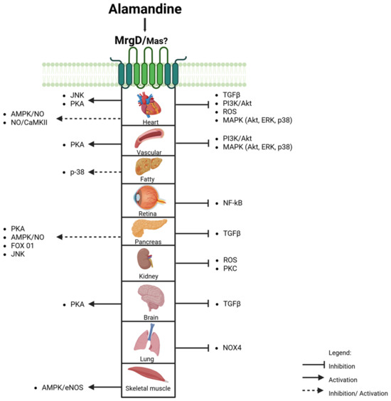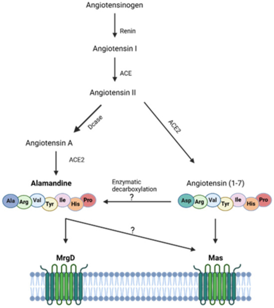 - Schleifenbaum, J. Alamandine and its receptor mrgd pair up to join the protective arm of the renin-angiotensin system. Front. Med. 2019, 6, 107. [Google Scholar] [CrossRef] [PubMed]