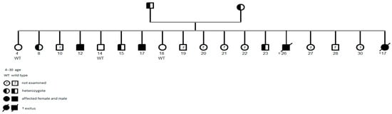 - Ramzan, K.; Imtiaz, F.; Taibah, K.; Alnufiee, S.; Akhtar, M.; Al-Hazzaa, S.A.; Al-Owain, M. COL4A4-related nephropathy caused by a novel mutation in a large consanguineous Saudi family. Int. J. Pediatr. Otorhinolaryngol. 2014, 78, 427–432. [Google Scholar] [CrossRef]