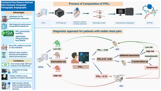 Computation pipeline, advantages, limitations, and diagnostic approach of coronary computed tomography-derived fractional flow reserve (FFRCT) in stable chest pain. Created in BioRender. Bozika, M. (2025) https://BioRender.com/dcmmr1g, accessed on 10 July 2025.