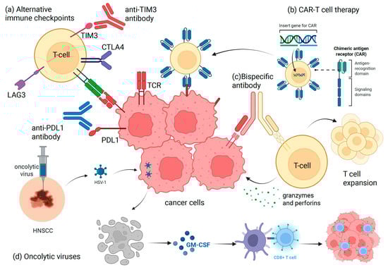 Graphical depiction of some of the immune-based novel approaches in HNSCC for consideration. (a) Antibodies targeting alternative immune checkpoints such as TIM-3, CTLA-4, LAG-3. (b) CAR-T cell therapy engineered to recognize specific HNSCC molecular targets. (c) Bispecific antibodies that can target two simultaneous binding domains to enhance T cell efficiency and engagement. (d) Oncolytic viruses targeting HNSCC-related viruses like HSV-1, activating CD8+ T cells through virus-mediated GM-CSF release. CAR, chimeric antigen receptor; CTLA-4, Cytotoxic T lymphocyte-associated antigen 4; HNSCC, head and neck squamous cell carcinoma; GM-CSF, granulocyte/macrophage colony stimulating factor; HSV-1, Herpes Simplex Virus-1; LAG-3, Lymphocyte-activation gene 3; PDL-1, programmed death-ligand 1; TCR, T cell.