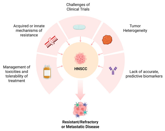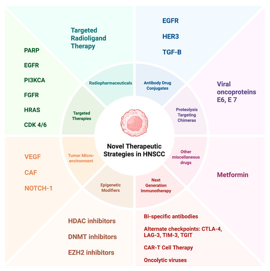 HNSCC remains a challenging malignancy to treat, especially in the recurrent or metastatic (R/M) setting where treatment options are limited. While epidermal growth factor receptor (EGFR) inhibitors (e.g., cetuximab) and PD-1/PD-L1 checkpoint inhibitors (e.g., pembrolizumab, nivolumab) have improved outcomes for some patients, many do not have a sustained response and eventually develop resistance [3,4]. This necessitates the development of newer therapeutic approaches that can allow us to target alternative pathways to overcome drug resistance. This review will focus on promising novel approaches currently under investigation for HNSCC.