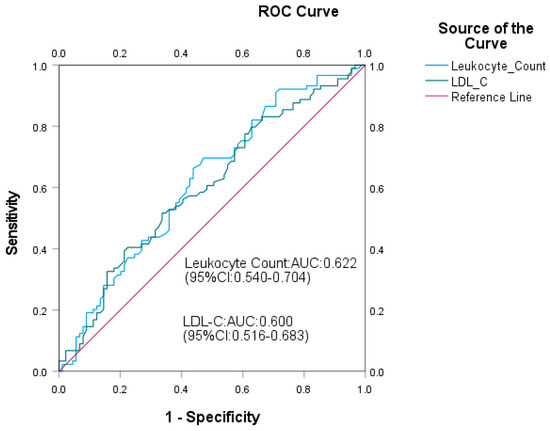 ROC curve analysis of the predictive effect of CAS progression predictors, based on the cutoff values of leukocyte count >5.00 × 109/L and LDL-C > 125.1 mg/dL, respectively.