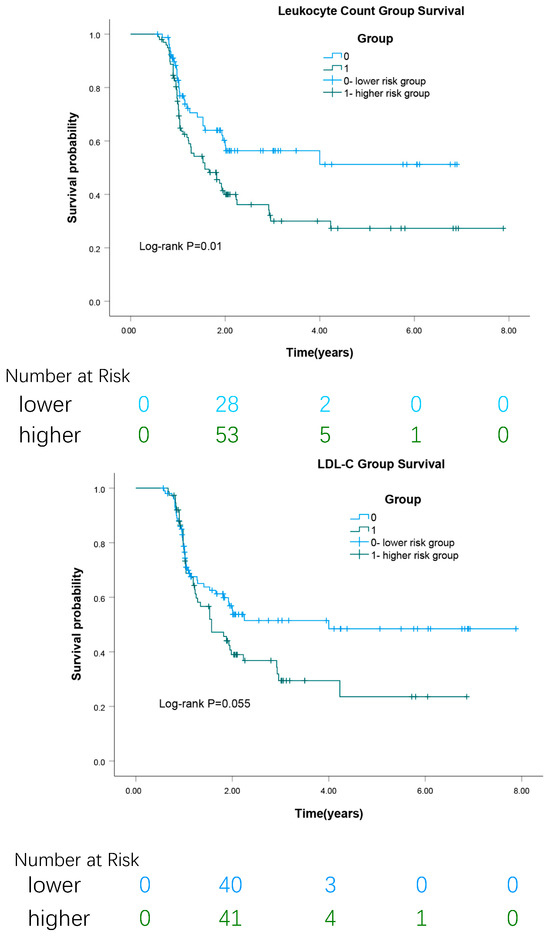 Kaplan–Meier analysis the survival rates, based on the classification of cutoff values of leukocyte count and LDL-C different levels, respectively.