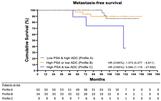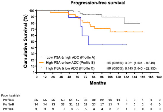 In our study, combining PSA and ADC values at 6 months post-RT enabled a more refined risk stratification, with patients with Profile C having lower PFS compared with patients with Profiles A and B, highlighting the additive prognostic value of combining both parameters. However, only nine patients in our cohort were classified as Profile C, underscoring the low frequency of this response pattern, characterized by both high PSA and low ADC values, following RT and ADT.