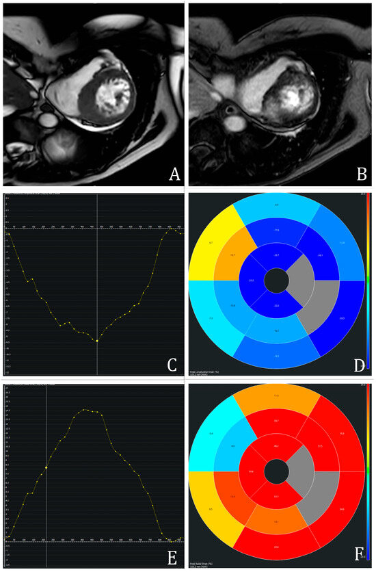 Example of CMR assessment in a patient with hypertrophic cardiomyopathy: Cine-short-axis view representing asymmetric septal hypertrophy of 21 mm (A) with corresponding midwall fibrosis determined with inversion–recovery late gadolinium enhancement image (B). Feature-Tracking-CMR with global longitudinal (C,D) and radial (E,F) strain parameters. The y-axis represents the percent of myocardial deformation, whereas the x-axis shows the corresponding time during the cardiac cycle.